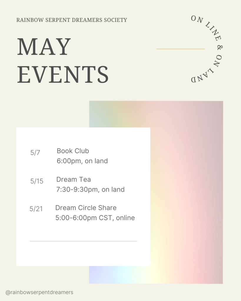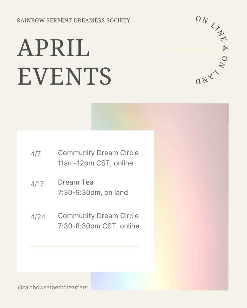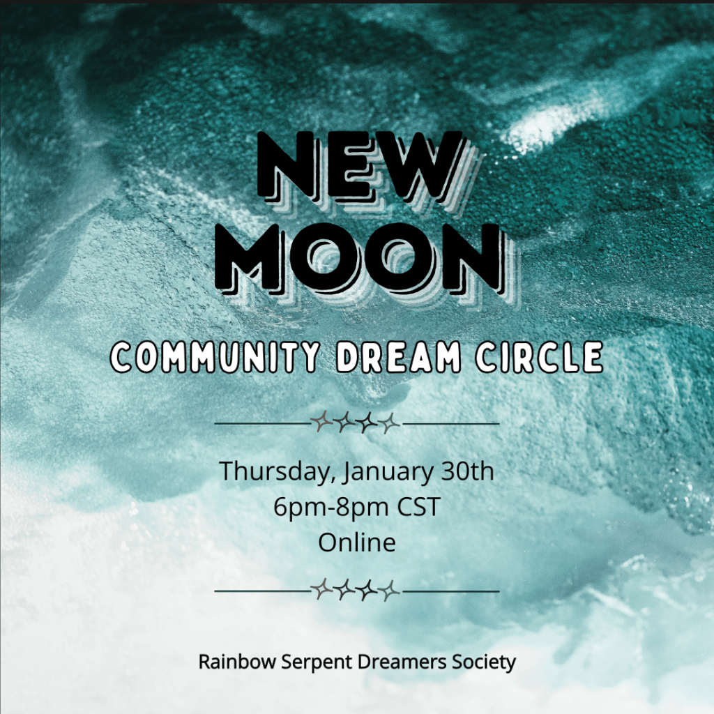New Moon Community Circle – Come to share a dream, ask questions, get support in your practice, or just listen. All are welcome and shares range from long detailed dreams to discussions of not being able to remember a single thing. DM for link or sign up for our newsletter