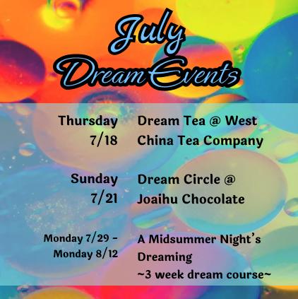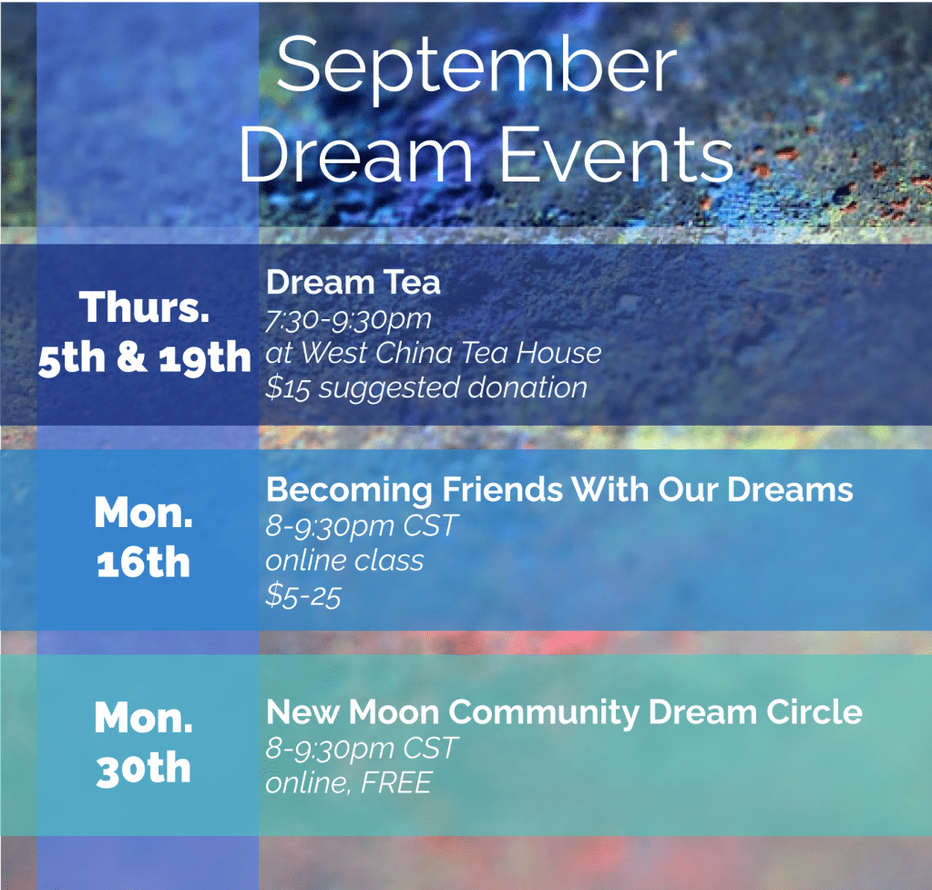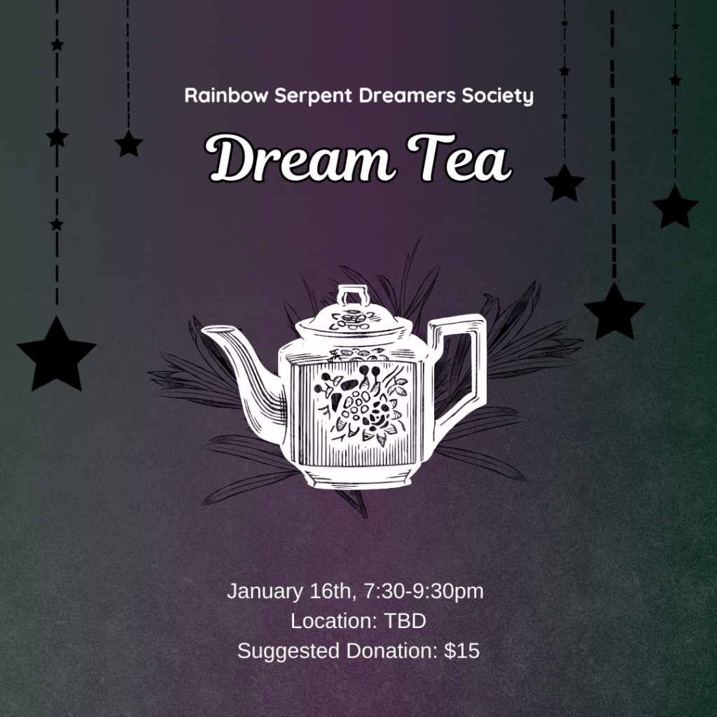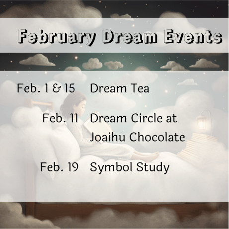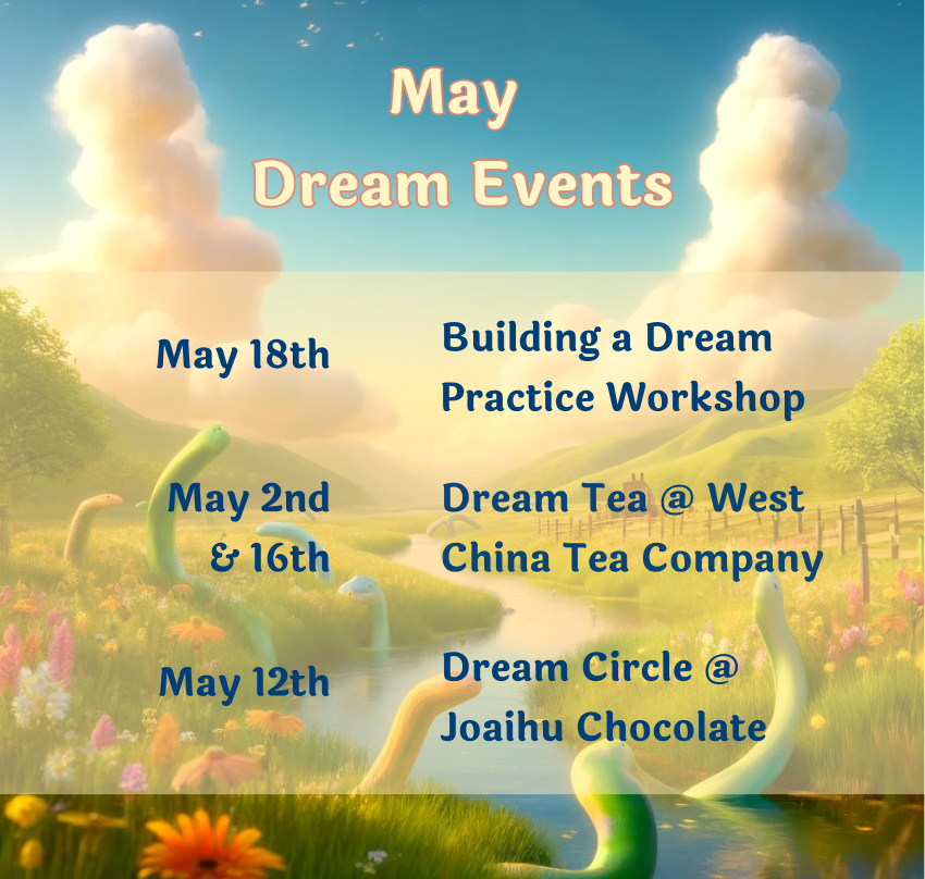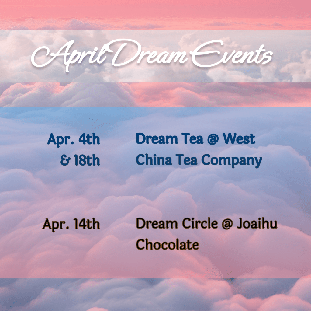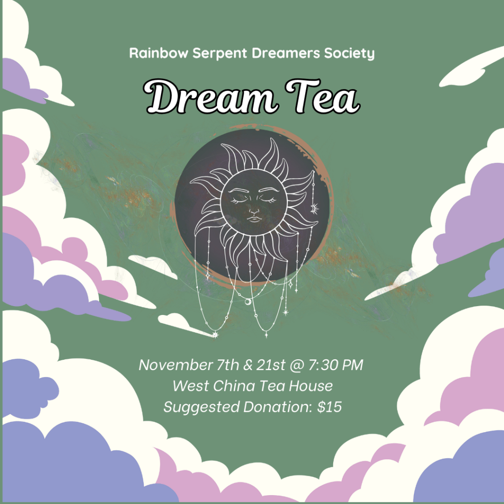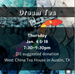 Join us at West China Tea House! Every 1st and 3rd Thursday, we gather to sip tea together and share our dreams. We each take turns sharing a dream from any time in our lives, and, if the dreamer would like, reflecting on it together.