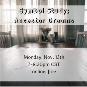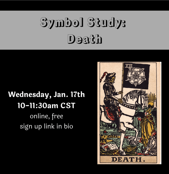 This month we’ll work a bit backwards, starting with this theme, and gathering the symbols that it shows up as. Come with any dreams of your ancestry or beloved dead. Or just come to listen and explore with us. We’ll be doing some meditation and journaling as well as lots of discussion.